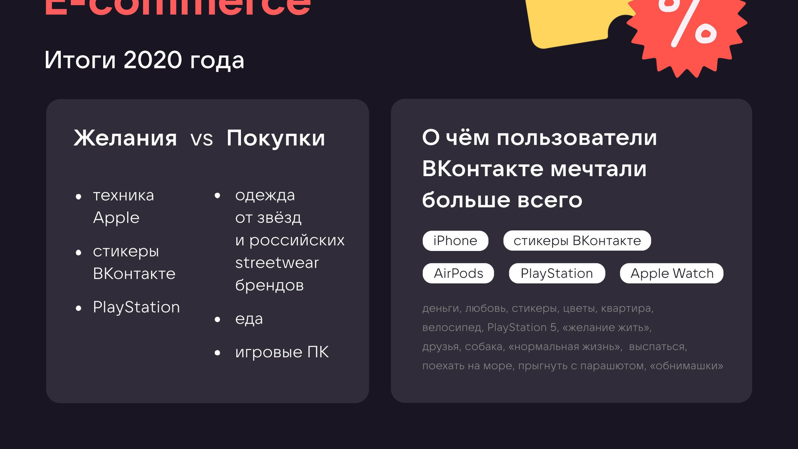 Для этого они учли, какие товары пользователи чаще всего добавляли в списки желаний, и сравнили мечты с реальными покупками. Среди самых популярных желаний оказались смартфоны, наушники, антисептики и стикеры ВКонтакте.