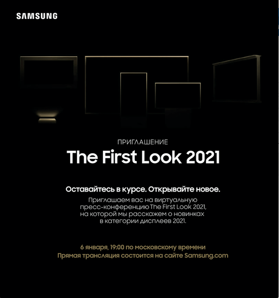 Samsung обычно начинает новый год с анонса своей новой линейки телевизоров. Компания организовала мероприятие под названием The First Look 2021, на котором она намерена представить новые технологии дисплеев, а также новые продукты и свое «видение будущего дисплеев».