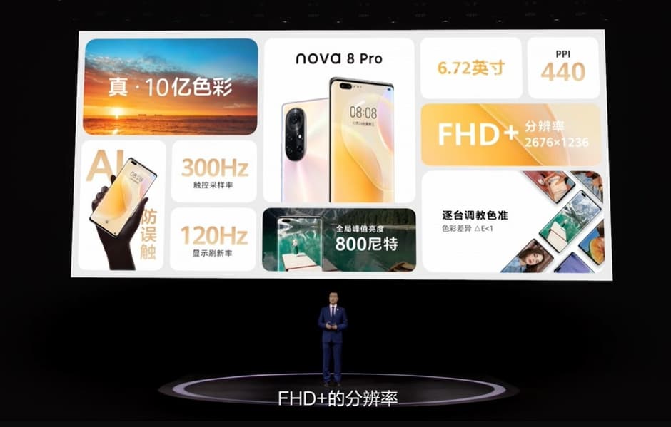Nova 8 получил экран OLED диагональю 6,57 дюйма разрешением 2340 х 1080 пикселей с кадровой частотой 90 Гц и частотой опроса сенсорного слоя 240 Гц. В Nova 8 Pro установлен дисплей OLED разрешением 2676 х 1236 пикселей с кадровой частотой 120 Гц и частотой опроса сенсорного слоя 300 Гц. Оба оснащены встроенными сканерами отпечатков пальцев и поддерживают 10-битное представление цвета. Фронтальные камеры врезанные, но в младшей модели она одна, а в старшей — две.