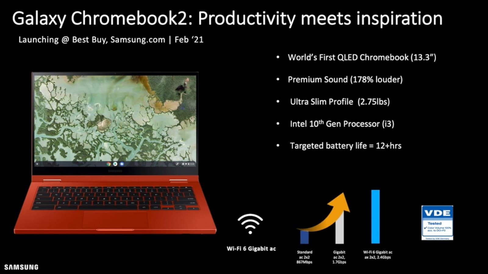 Также говорится, что Galaxy Chromebook 2 будет иметь 13,3-дюймовый QLED-дисплей и станет первым хромбуком с таким экраном. Оригинальный Chromebook Galaxy компании был оснащен дисплеем 4K AMOLED. Новинка будет иметь тонкий корпус массой 1,2 кг. Устройство также будет оснащено процессором Intel Core i3 10-го поколения и премиальный звуком (заявлено, что он будет на 178% громче, чем оригинальная модель).