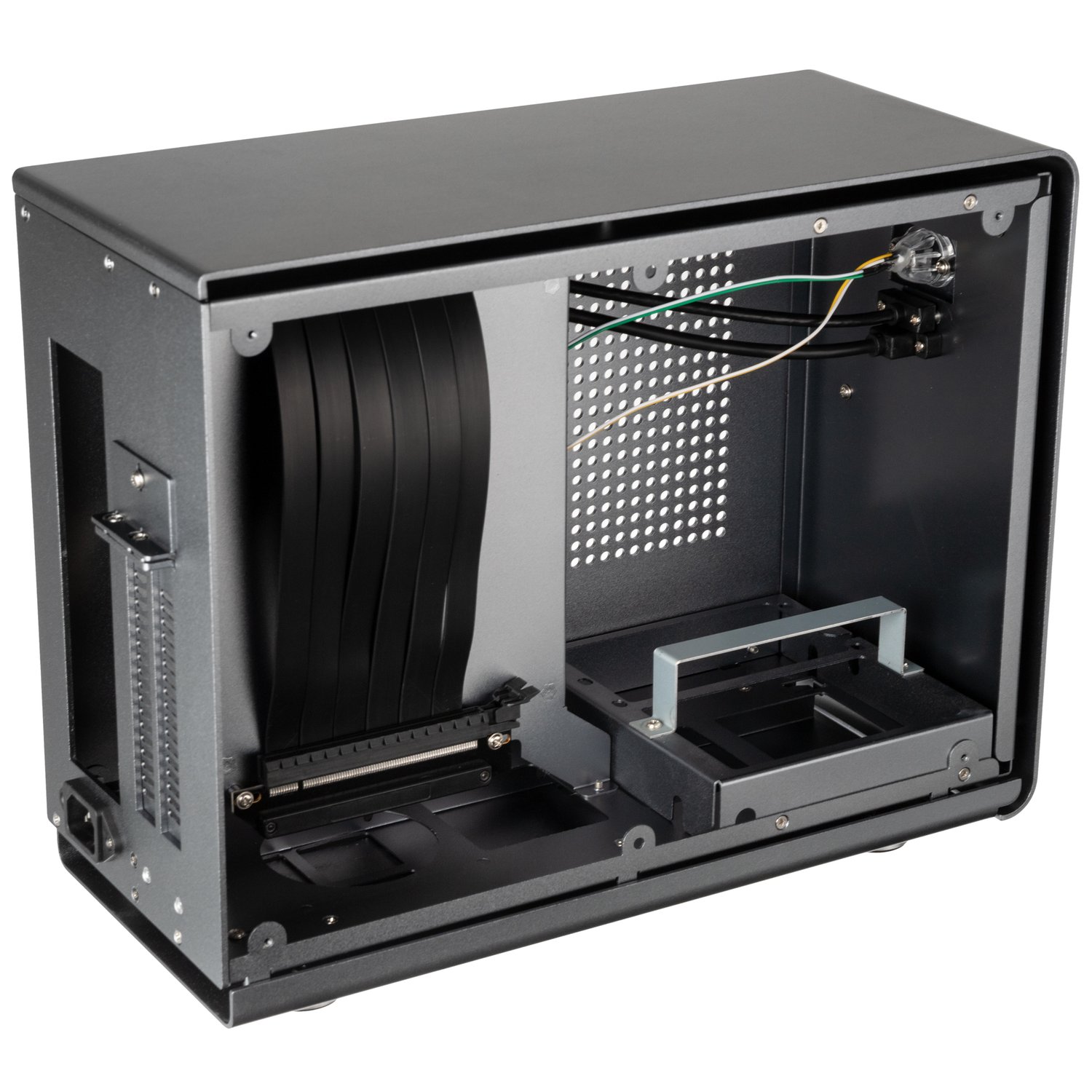 В корпусе помещается блок питания стандарта SFX или SFX-L, до двух накопителей типоразмера 2,5 дюйма и видеокарта длиной до 330 мм и шириной до 2,9 слота. Максимально допустимая высота процессорной системы охлаждения равна 63 мм. Возможна установка СЖО, но только с радиатором, на котором установлен 92-миллиметровый вентилятор. Штатно на этих точках крепления закреплен корпусной 92-миллиметровый вентилятор с гидродинамическим подшипником. Скорость вращения вентилятора регулируется с помощью ШИМ. В комплект также входит кабель-удлинитель PCIe 16x Gen3.1 длиной 280 мм.