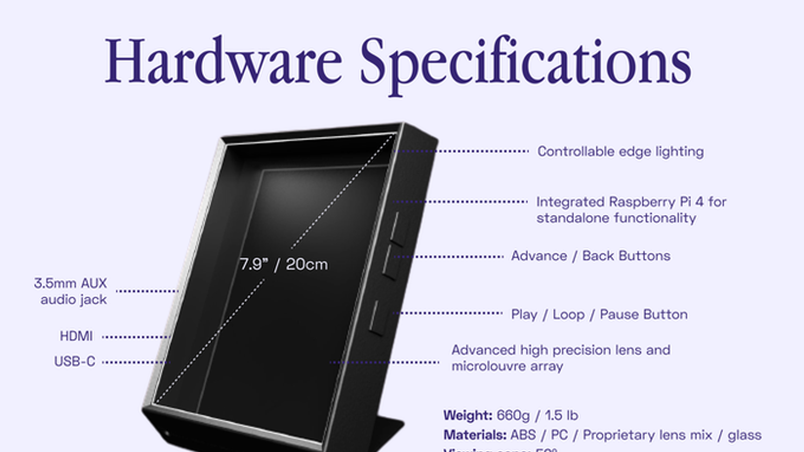 Дисплей размером 20 см по диагонали характеризуется соотношением сторон объемного кадра 4:3:2. Угол обзора равен 58°, а для формирования объемного изображения в нем используется 45-100 кадров. Входное разрешение — 1536 х 2048 пикселей. Весит дисплей 660 г.