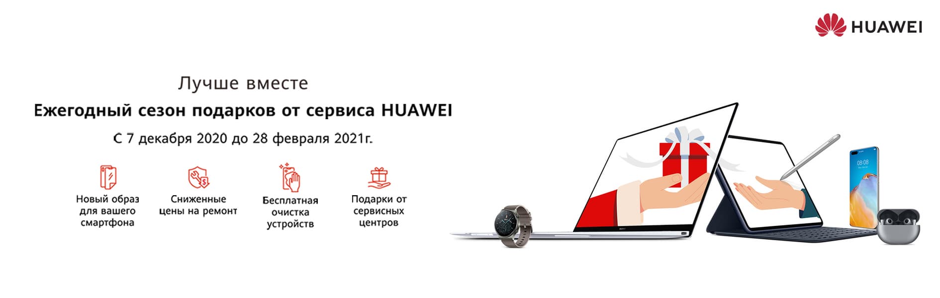 Компания Huawei объявляет о начале акции «Ежегодный сезон подарков от сервиса Huawei» в авторизированных сервисных центрах и приемных пунктах, которая продлится до 28 февраля 2021 года.
