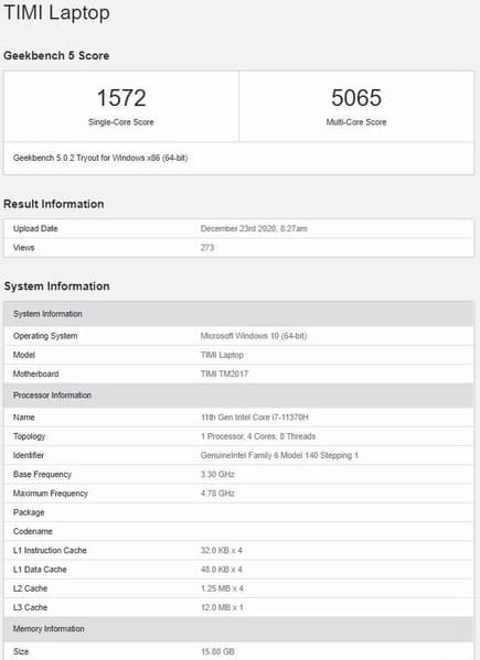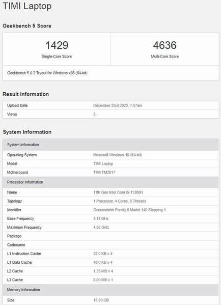 В бенчмарке Geekbench новые Mi Notebook Pro (под обозначением TIMI Laptop) засветились как с шестиядерным APU AMD Ryzen 5 5600H (3,3-4,24 ГГц), так и с двумя четырехъядерными CPU Intel серии Tiger Lake-H — Core i7-11370H (3,3-4,8 ГГц) и Core i5-11300H (3,1- 4,4 ГГц). Объем оперативной памяти во всех случаях составил 16 ГБ.