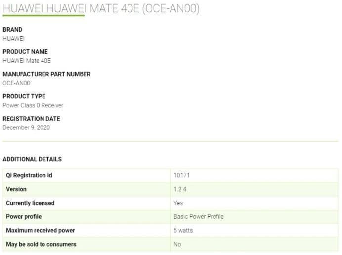 Такой смартфон, обозначенный каталожным номером OCE-AN00, засветился в базе данных организации Wireless Power Consortium (WPC), которая занимается сертификацией беспроводных зарядных устройств. Как видно, «получаемая мощность» такой зарядки в Mate 40E составляет 5 Вт. Ранее Huawei OCE-AN00 уже отметился в базе TENAA, благодаря чему есть данные об остальных характеристиках Mate 40E.