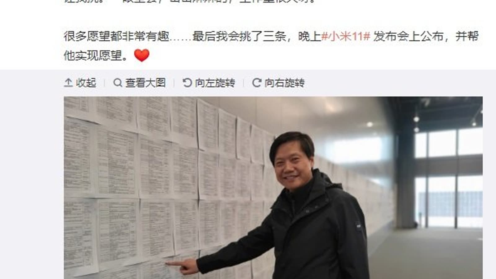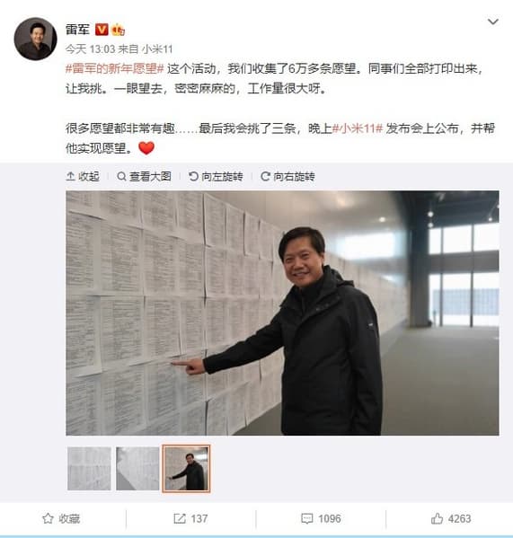 Компания Xiaomi вовсю готовится к официальной премьере своего нового флагмана Mi 11: генеральная репетиция завершилась еще вчера, о чем в соцсети Weibo отчитался глава фирмы Лей Цзунь (Lei Jun), а сегодня он же, уже на сцене, выполнит желания трех человек. Непременное условие этих желаний — они должны быть связаны с Mi 11.