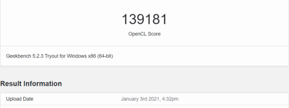 В тесте OpenCL GeForce RTX 3080 Mobile набрала 139 181 балл — это больше, чем у настольных GeForce RTX 3070 (132 917 баллов) и GeForce RTX 2080 Ti (137 217 баллов). В то же время мобильная GeForce RTX 3080 примерно на 30% отстает от настольной GeForce RTX 3080 (180 010 баллов).