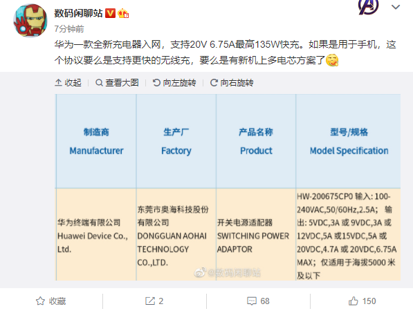 Компания Huawei сертифицировала на домашнем рынке у местного регулятора 3С новое зарядное устройство HW-200675CP0, поддерживающее шесть вариантов мощности: 15, 27, 60, 75, 94 и 135 Вт! В последнем случае напряжение составляет 20 В, а сила тока — 6,75 А. Естественно моментально такую зарядку приписали перспективным смартфонам Huawei. А какой из них самый перспективный? Конечно же Huawei P50.