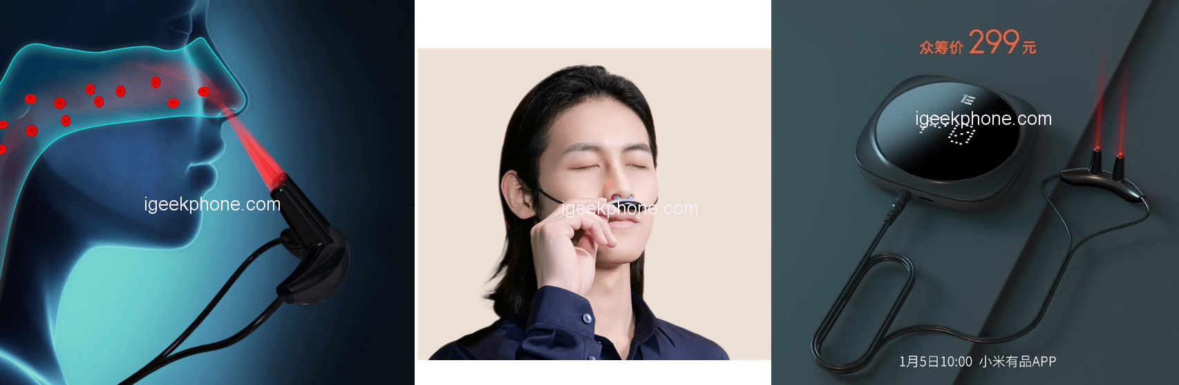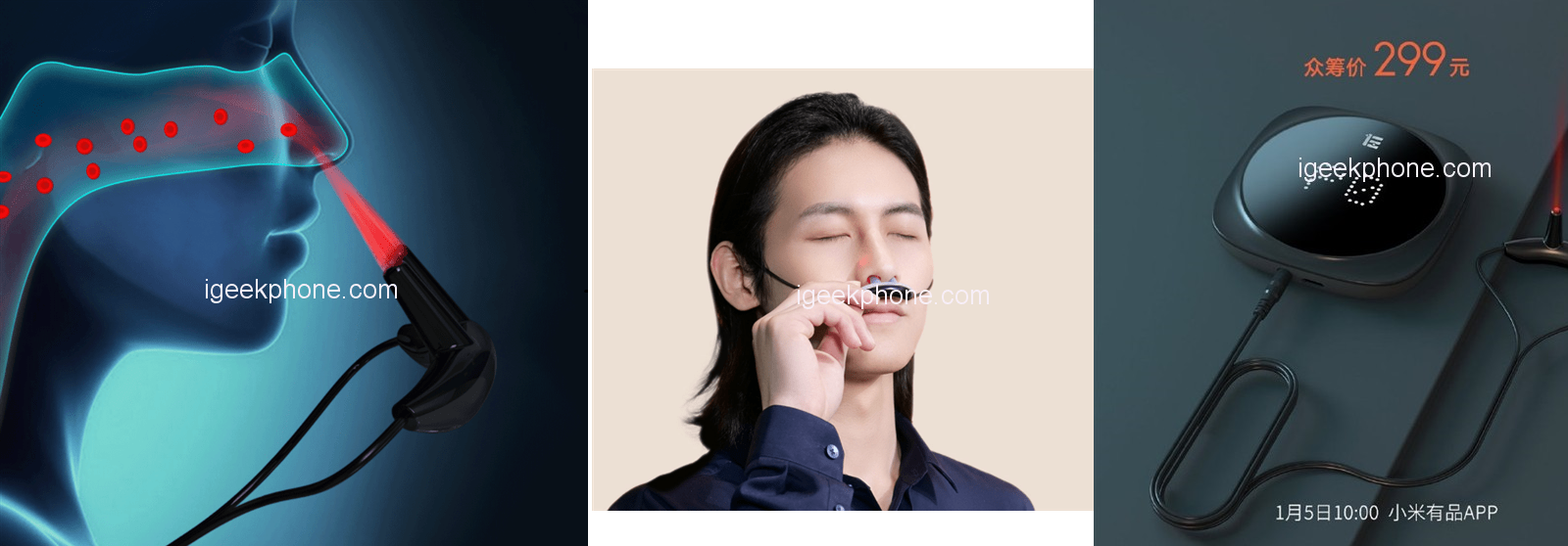 На платформе коллективного финансирования Xiaomni Youpin представлено портативное устройство для лазерной терапии ринита — синдрома воспаления слизистой оболочки носа. Инфекционный ринит вызывается микробами и вирусами, а развитию ринита способствует переохлаждение и грязный воздух.