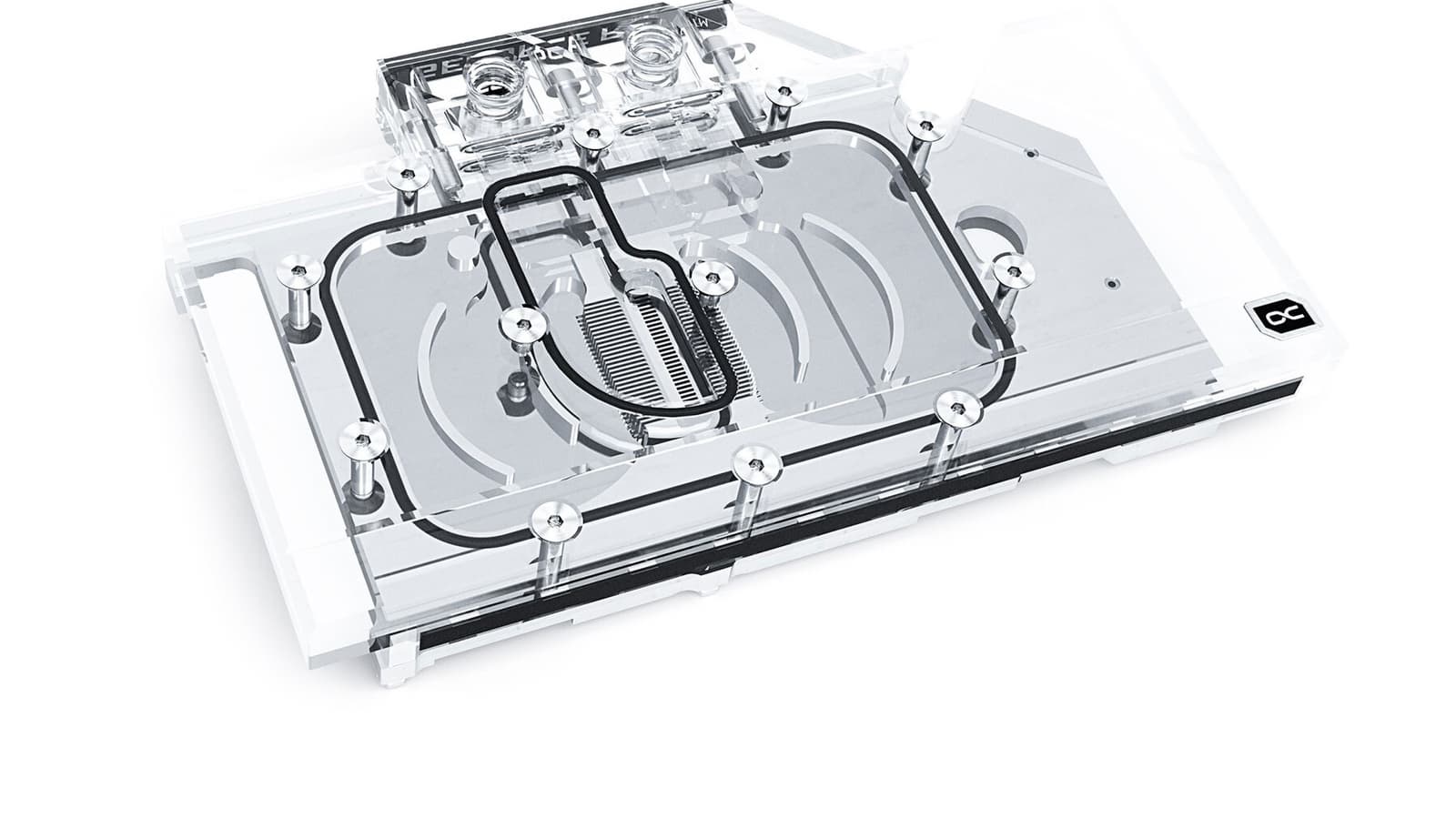 Водоблок с полным покрытием отводит тепло не только от GPU, но и от других источников тепла на плате. Его основание изготовлено из меди и никелировано. Крышка изготовлена из прозрачного пластика. Она одновременно служит рассеивателем светодиодной подсветки. В комплект входит черная алюминиевая пластина, закрепляемая на тыльной стороне платы и распределяющая тепловые и механические нагрузки.