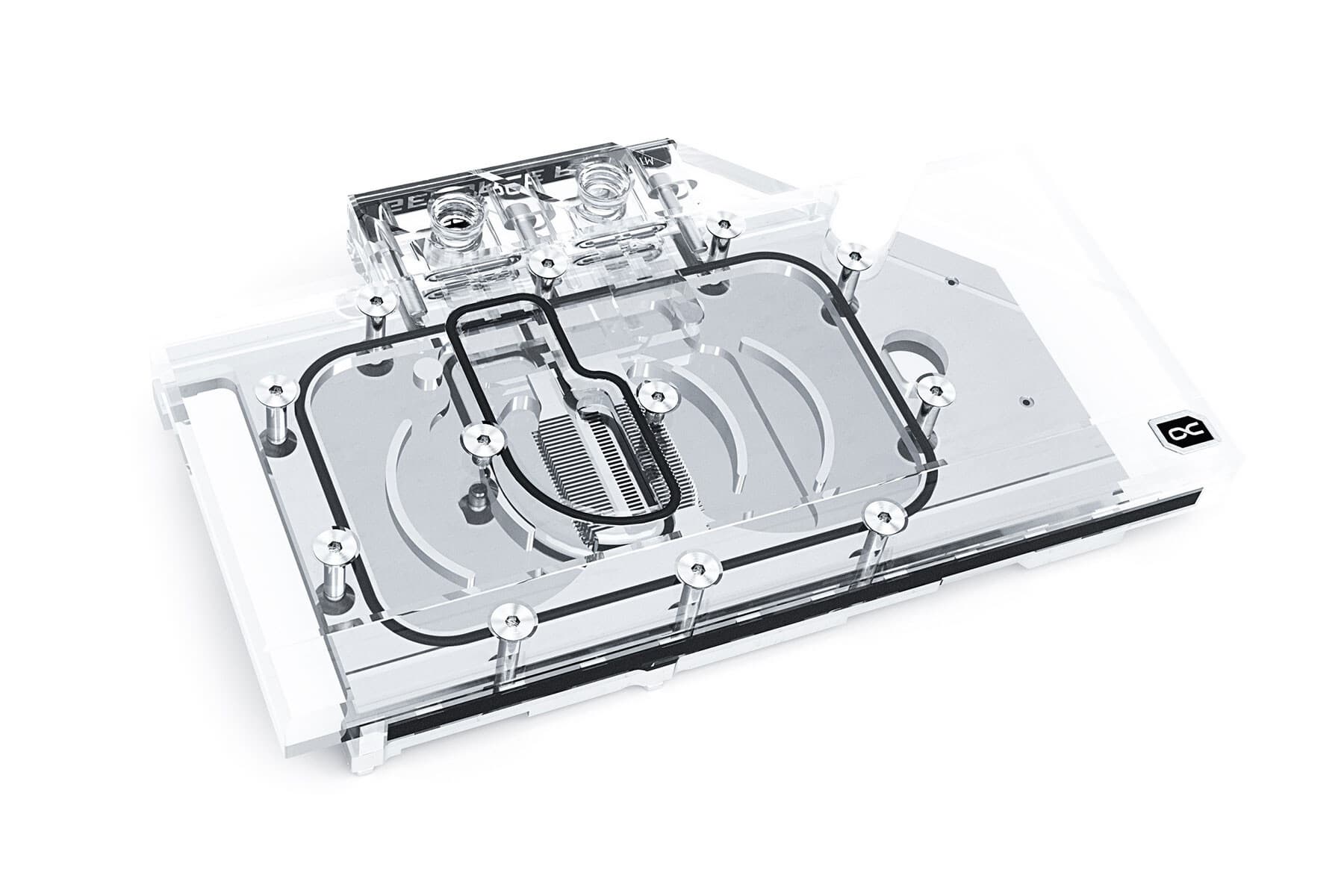 Водоблок с полным покрытием отводит тепло не только от GPU, но и от других источников тепла на плате. Его основание изготовлено из меди и никелировано. Крышка изготовлена из прозрачного пластика. Она одновременно служит рассеивателем светодиодной подсветки. В комплект входит черная алюминиевая пластина, закрепляемая на тыльной стороне платы и распределяющая тепловые и механические нагрузки.
