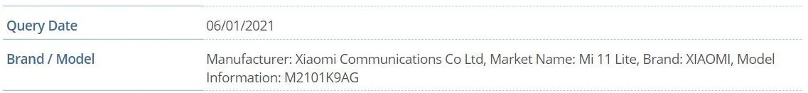 Смартфон с модельным номером M2101K9AG прошёл сертификацию Федеральной комиссии по связи США (Federal Communications Commission, FCC). В базе данных указаны некоторые характеристики и даже есть подтверждение, что на прилавках магазинов смартфон появится под названием Xiaomi Mi 11 Lite.