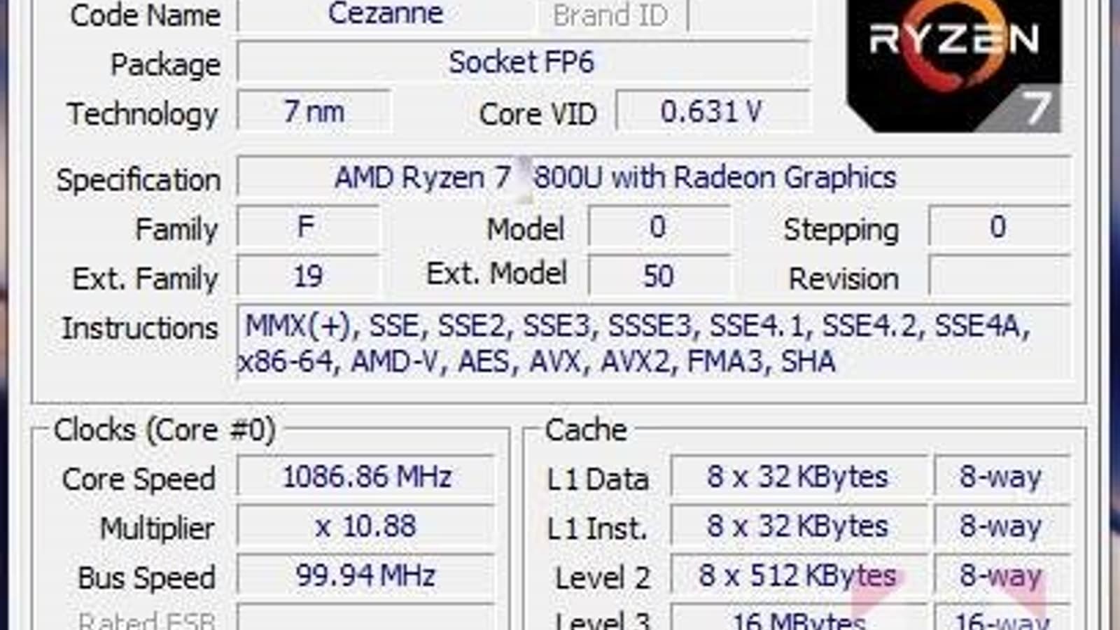 Одному из пользователей удалось протестировать не представленный пока официально мобильный APU AMD Ryzen 7 5800U в бенчмарке CPU-Z. Напомним, Ryzen 7 5800U построен на архитектуре Zen3 и относится к линейке Cezanne. В его состав входит восьмиядерный центральный процессор с поддержкой многопоточности, работающий на частоте 2,0-4,4 ГГц, 2 МБ кэш-памяти второго уровня и 16 МБ кэш-памяти третьего уровня, а также GPU Vega. TDP APU — от 15 до 25 Вт.