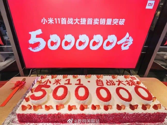На фото можно увидеть, как топ-менеджеры Xiaomi отмечают полмиллиона продаж Xiaomi Mi 11 тортиком.
