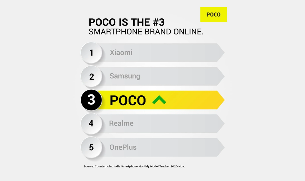 Данную информацию опубликовали на страничках Poco в социальных сетях. В ноябре 2020 года Poco опередила OnePlus и Realme и стала третьим по величине брендом смартфонов в Индии по онлайновым продажам. Первое и второе места занимают Xiaomi и Samsung соответственно.