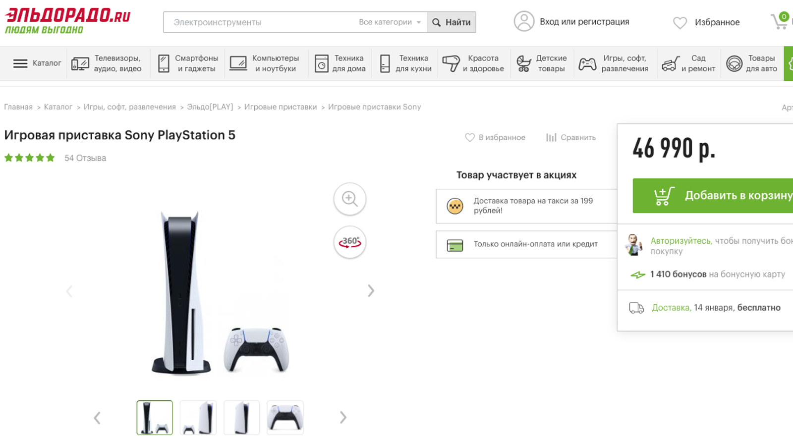 На момент написания новости в «Эльдорадо» можно купить стандартную версию Sony PlayStation 5. Купить приставку можно исключительно при условии оплаты онлайн на сайте. Цена тоже осталась стандартной — 46 990 рублей. Версия Digital Edition без оптического привода не предлагается. Можно с уверенностью сказать, что все доступные Sony PlayStation 5 разлетятся как горячие пирожки.