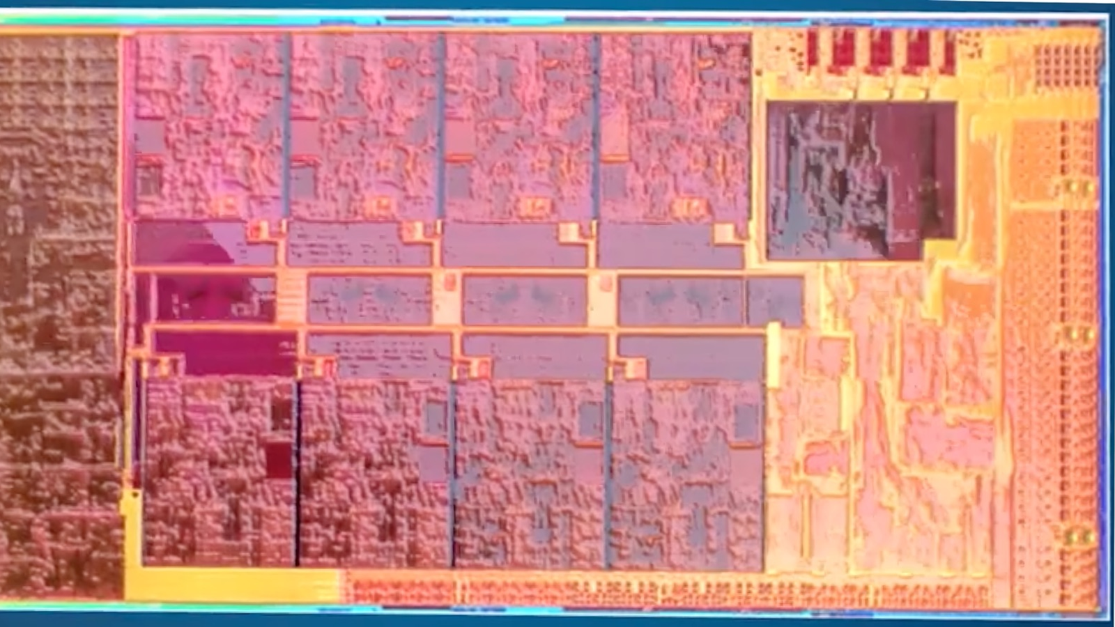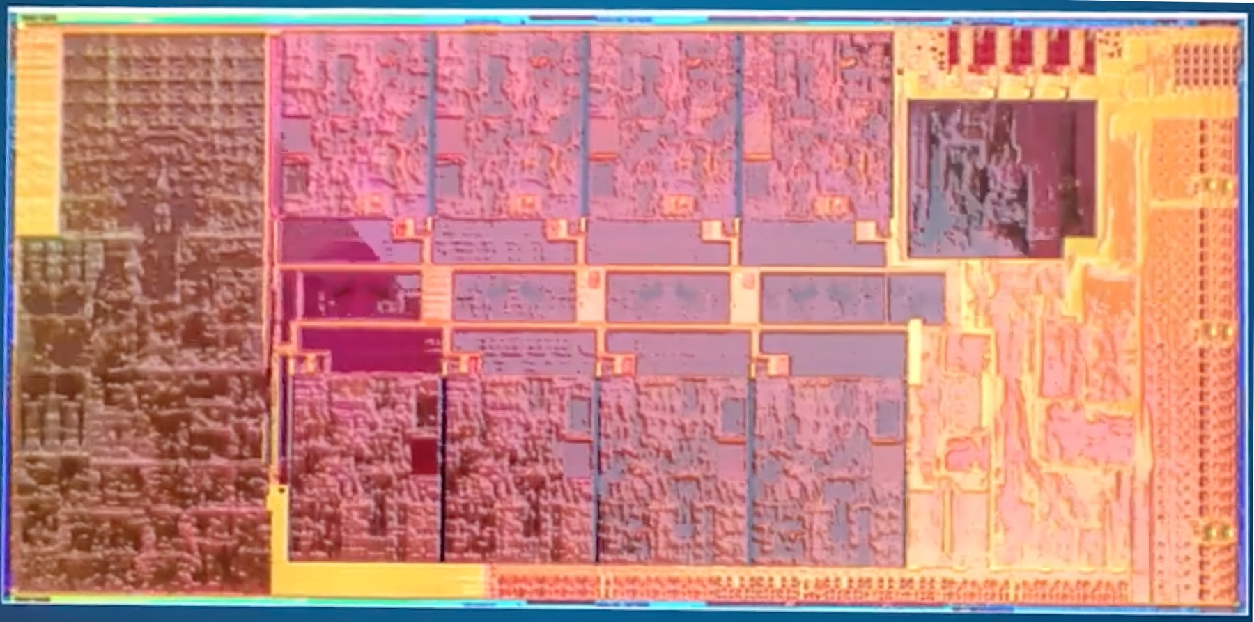 Никаких разъяснений тут нет, но как минимум восемь ядер на кристалле отлично различимы. Также, вероятно, мы можем видеть кэш-память третьего уровня и GPU Xe.