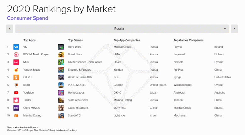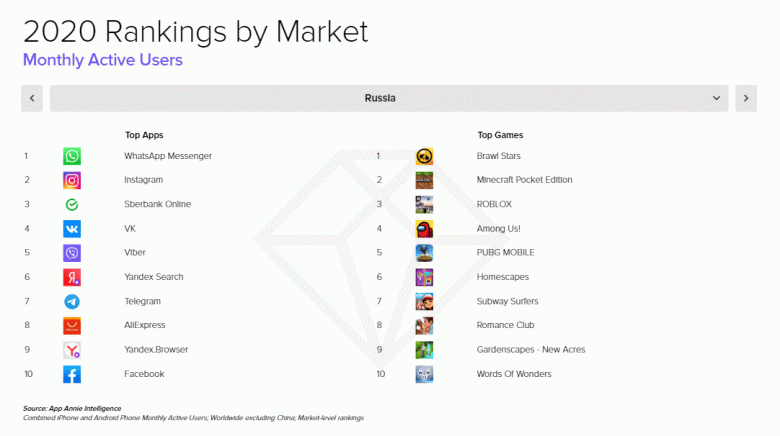Самыми «денежными» приложениями оказались соцсеть ВКонтакте, музыкальный сервис Boom и онлайн-кинотеатр ivi. По количеству загрузок лидируют TikTok, WhatsApp и Telegram. Лидеры по количеству активных пользователей — WhatsApp, Instagram и «Сбербанк Онлайн».
