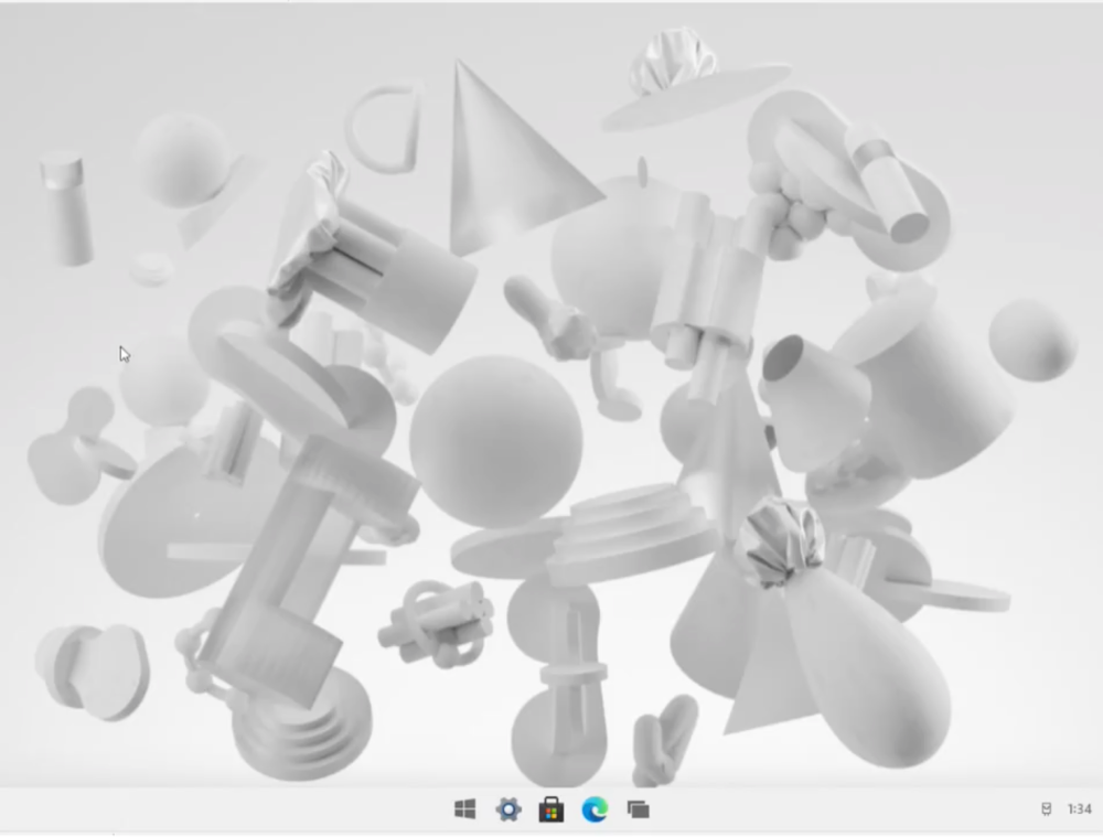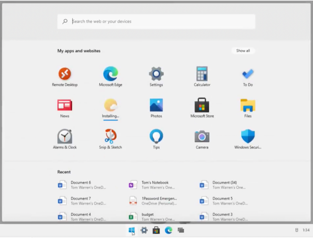 Меню «Пуск» и панель задач расположены по центру, большие значки будут удобны для сенсорного управления. В панели задач размещены значки Microsoft Edge, Files, Outlook и хранилища.