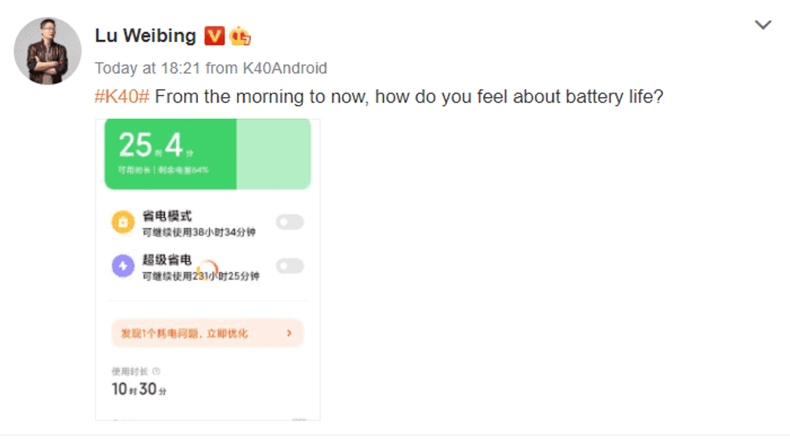 Глава бренда Redmi Лю Вейбинг (Lu Weibing) опубликовал в Сети скриншот смартфона. Вроде бы, рядовое событие, если бы не одно «но»: приложение Weibo определило смартфон как пока не выпущенный Redmi K40. А на скриншоте содержится информация об автономности устройства.