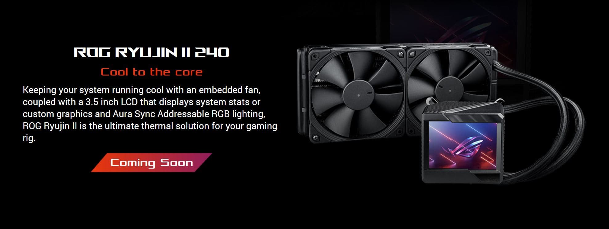 Новинка является преемницей модели ROG Ryujin 240. У них идентичная конструкция, и у первой модели тоже был экран, но существенно меньшего размера. К сожалению, других подробностей Asus не раскрывает, но, скорее всего, отличий новой модели от старой будет минимум. В любом случае, исходя из названия, мы точно говорим о радиаторе длиной 240 мм.