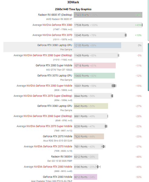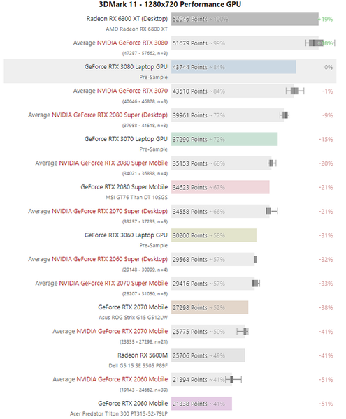 Мобильная RTX 3070 отстаёт от старшей сестры на 9% и на 5% отстаёт от настольной RTX 2080 Super. То есть теоретически мобильная RTX 3070 будет более выгодной покупкой, хотя, конечно, всё зависит от конкретных моделей ноутбуков. Также эта новинка на 7% опережает мобильную RTX 2080 Super, на 10% быстрее настольной RTX 2070 Super и на 28% быстрее мобильной.