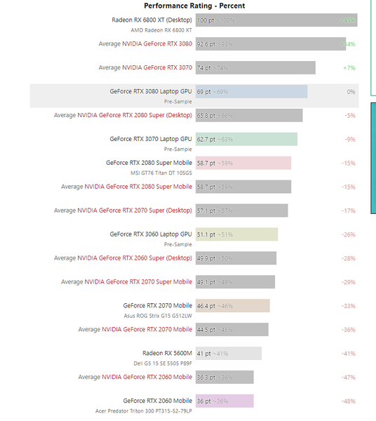 Младшая мобильная RTX 3060 выступает на уровне настольной RTX 2060 Super и на 4% опережает мобильную RTX 2070 Super. При этом мобильная RTX 2060 медленнее уже на 29%.