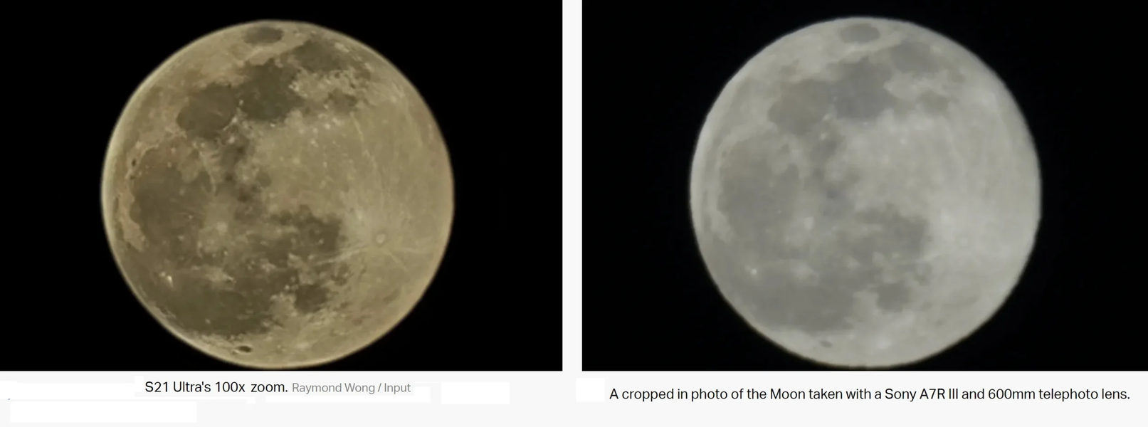 Рэймонд Вонг (Raymond Wong) из Input Magazine провёл эксперимент — снял светящийся «луноподобный» объект на Galaxy S21 Ultra и наложил на него нужную текстуру, а затем сравнил его с настоящим снимком Луны, сделанным на фотоаппарат Sony A7R III за 4800 долларов.