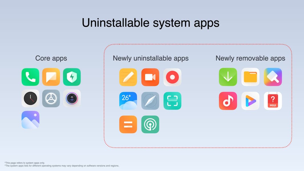 Ещё одним «гвоздём программы» стало объявление о возможности удалять системные приложения. Как обещает производитель, большинство системных приложений можно удалить, а «ключевые» приложения, необходимые для работы системы, можно скрыть.