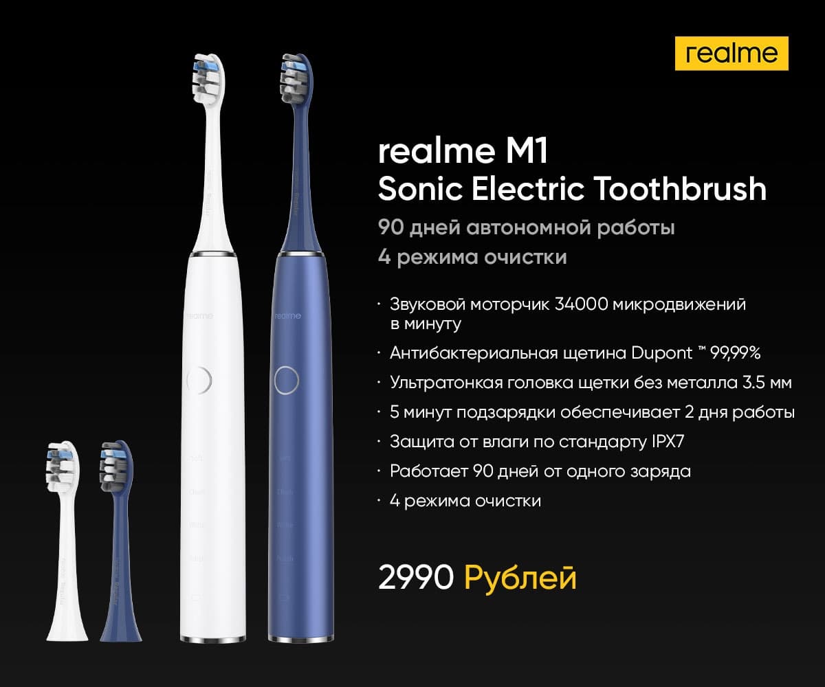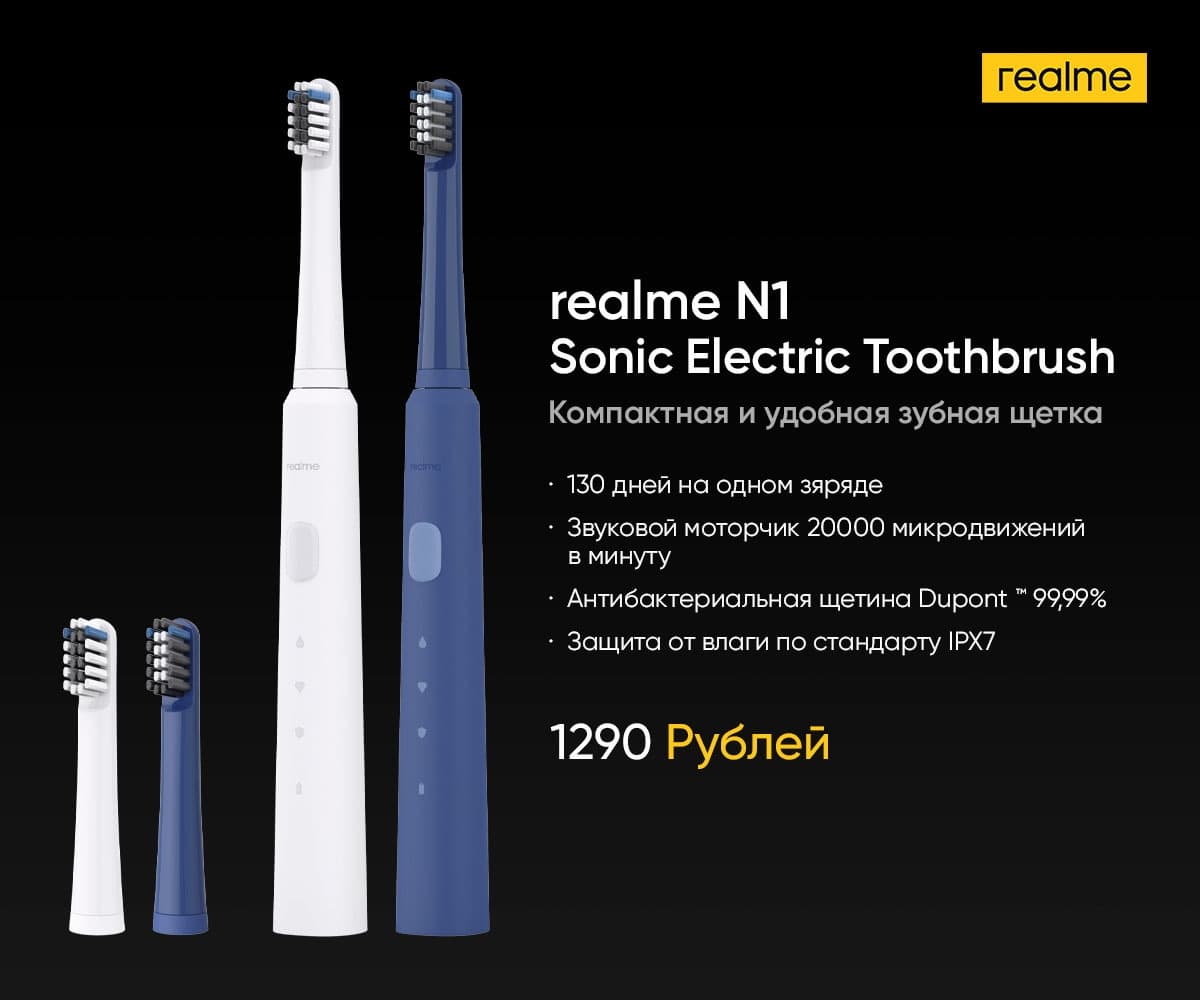 Также представлены электрические зубные щётки Realme N1 Sonic Electric Toothbrush и M1 Sonic Electric Toothbrush. Первая доступна по цене 1 290 рублей, вторая — 2 990 рублей.