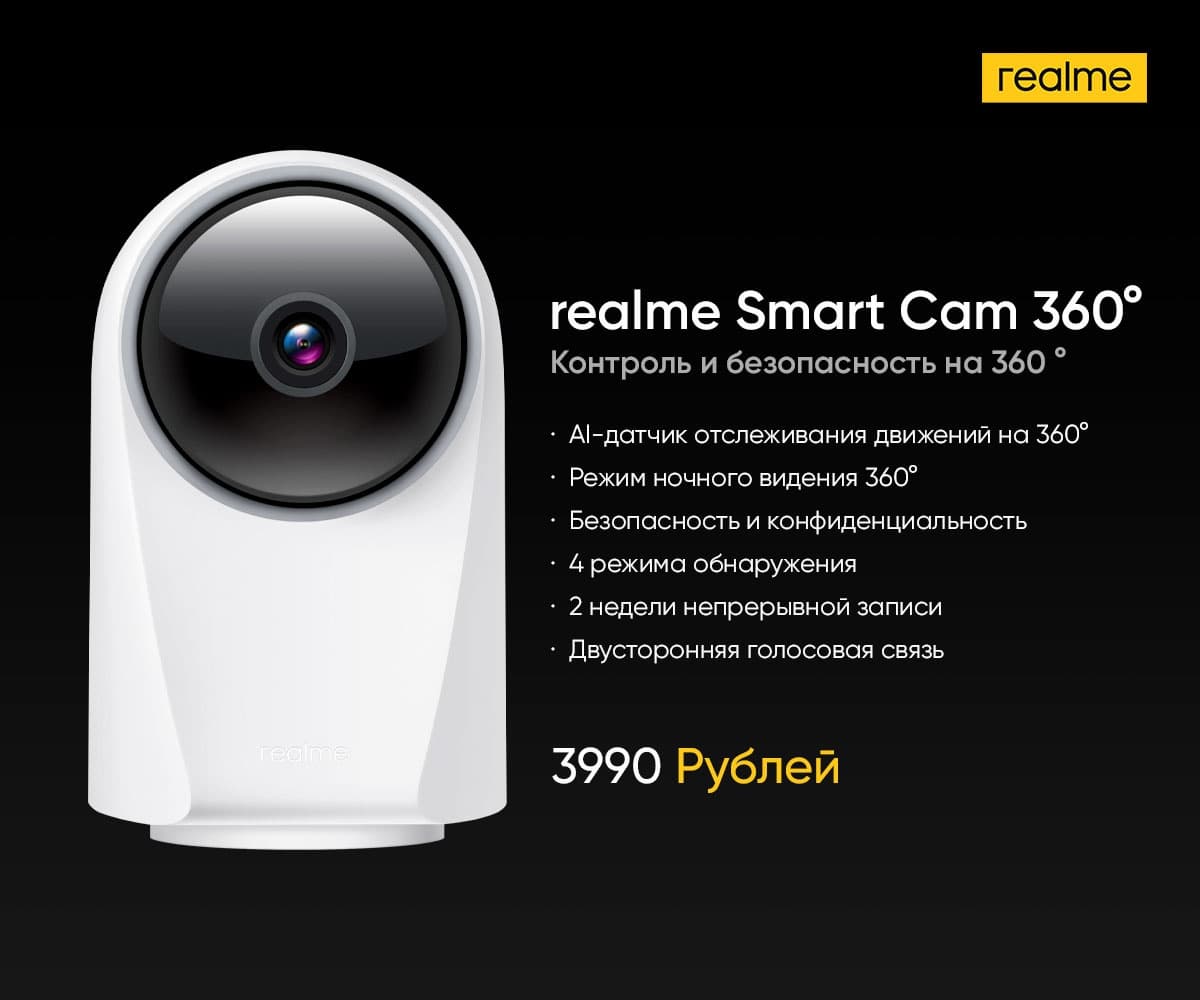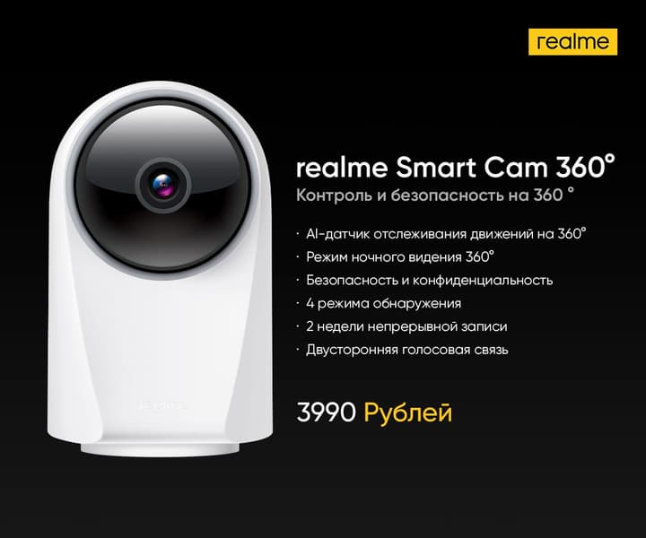 Камера видеонаблюдения для дома Realme Smart Cam 360° предлагается за 3 990 рублей. Среди её особенностей следующие: датчик отслеживания движений на 360° с системой искусственного интеллекта, режим ночного видения на 360°, режим обнаружения, до 14 дней записи в разрешении 1080P с картой памяти 128 ГБ, двусторонняя голосовая связь.