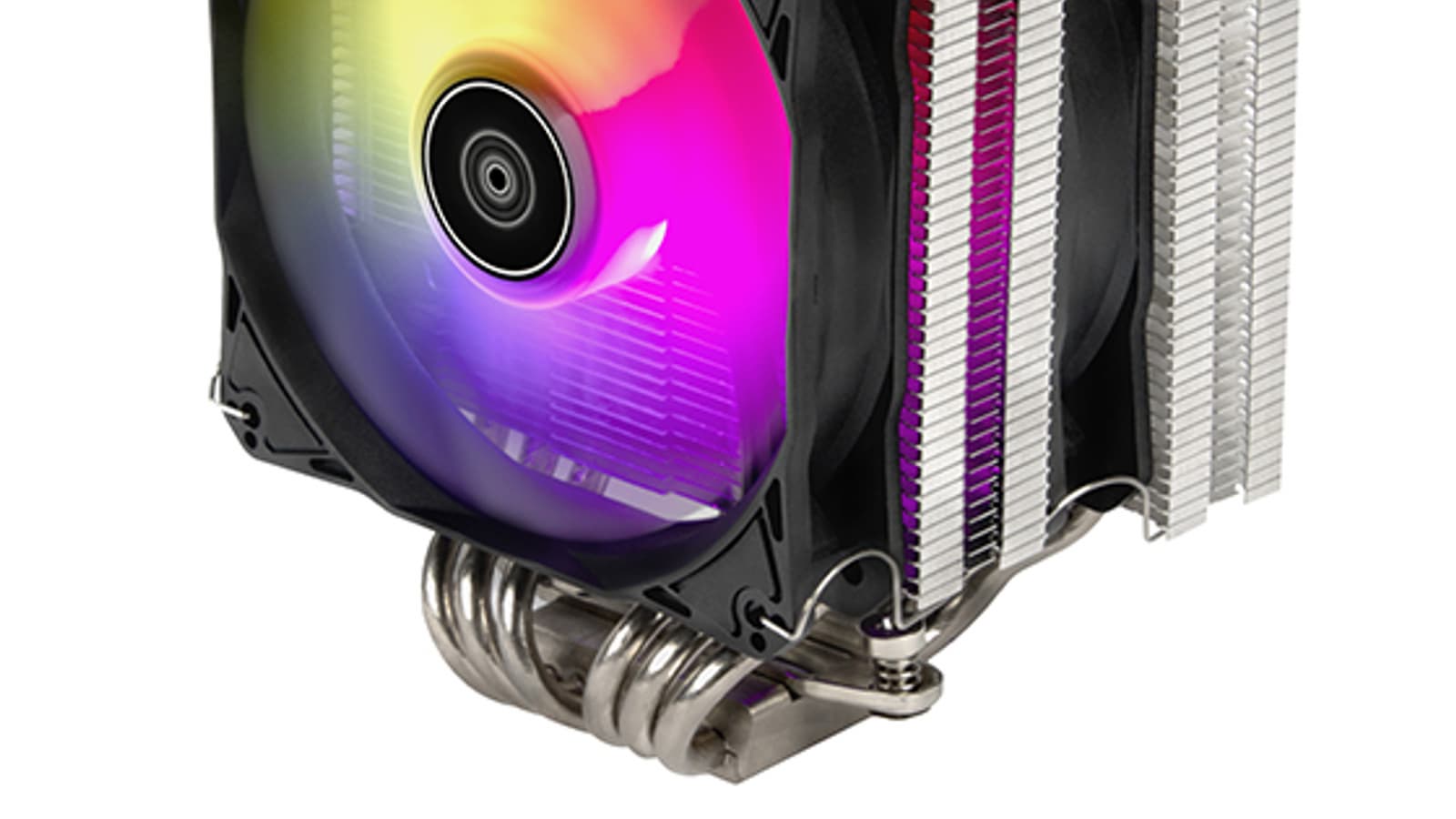 На радиаторе закреплены два 120-миллиметровых вентилятора с гидравлическими подшипниками. Скорость вращения крыльчаток с девятью лопастями регулируется с помощью ШИМ в диапазоне от 0 до 1 850 об/мин. Максимальным оборотам соответствуют воздушный поток 95,6 м3/ч и уровень шума 30,5 дБА. Срок службы заявлен равным 35 000 ч. Каждый вентилятор украшен восемью адресуемыми светодиодами RGB. Подсветка совместима с популярными системами управления.