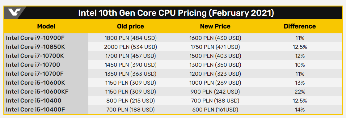 А вот процессоры Intel, которые в прошлом году долго были в дефиците, напротив, падают в цене! Источник сопоставил текущие цены на CPU Core 10-го поколения с теми, что были несколько недель назад, и пришёл к выводу, что за это время они снизились в среднем на 13%. Не особо много, но всё же заметно. При этом как минимум одна модель подешевела более чем на 20%, а это весьма существенно. Правда, в данном случае взяты цены в Польше, так что других странах ситуация может быть несколько иная.