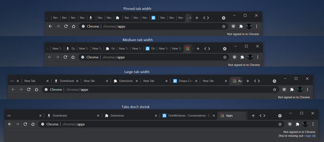 В дополнение к прокрутке, Google начала экспериментировать с шириной вкладок. В ранней тестовой сборке Chrome Canary 90 помимо прокрутки также можно выбрать степень, до которой вкладки будут сжиматься, прежде, чем скрыться. Доступны варианты вообще без сжатия, «большая» ширина, «средняя» и до состояния закреплённой вкладки.