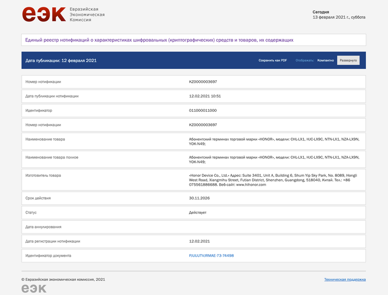 В базе данных ЕЭК появились модели Honor под номерами CHL-LX1, HJC-LX9C, NTN-LX1, NZA-LX9N, YOK-N49. Предположительно, под номером YOK-N49 скрывается тот самый флагман Honor View40.