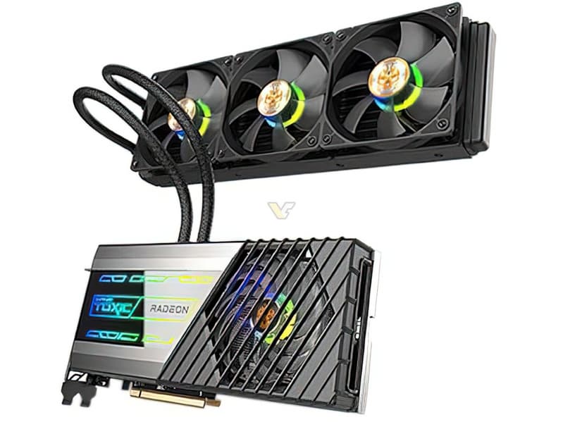 Само собой, Radeon RX 6900 XT Toxic — далеко не самая заурядная модель, иначе такую прибавку в стоимости сложно было бы оправдать. Она оснащена жидкостным охлаждением, причём в комплекте все компоненты — и насос, и массивный радиатор формата 360 мм с тремя подсвеченными вентиляторами.