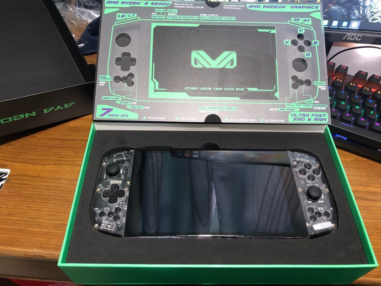 Разработка Aya Neo, первой портативной игровой консоли на процессоре AMD Ryzen, началась до выхода процессоров Ryzen 5000 (Cezanne), поэтому основой устройства выступает APU AMD Ryzen 5 4500U (Renoir) с шестиядерным центральным процессором на архитектуре Zen 2 и графическим процессором Radeon 6 Vega с 6 вычислительными блоками (384 потоковых процессора).