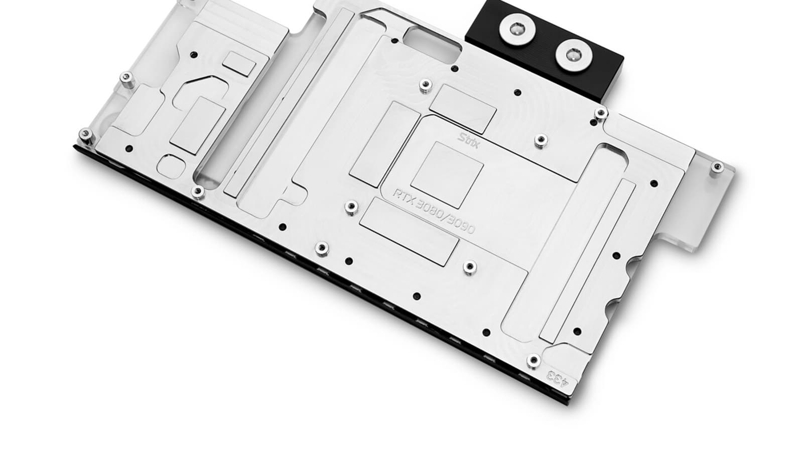 Медное никелированное основание шириной 126 мм и длиной 237 мм покрывает все ключевые источники тепла: графический процессор, память и компоненты подсистемы питания. Причем, охлаждаются не только регуляторы напряжения, но также контроллер ШИМ и дроссели. По словам производителя, последнее уменьшает вероятность появления свиста в процессе работы дросселей. Для улучшения теплопередачи с внутренней стороны основания, на участке, контактирующем с GPU, сформировано 28 ребер, образующих массив микроканалов шириной 0,6 мм. Верхняя часть водоблока изготовлена из прозрачного акрилового пластика.