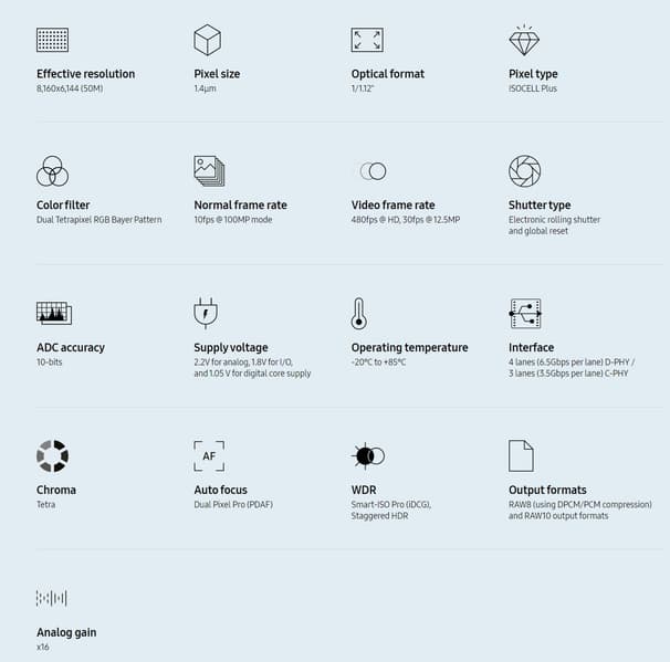 ISOCELL GN2 поддерживает съёмку видео Full HD+ на скорости 480 к/с и 4K на скорости 120 к/с. Samsung уже начала массовое производство датчика.