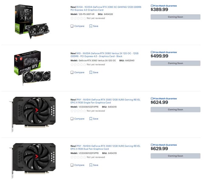Новинка уже представлена в каталогах разных онлайновых и обычных магазинов, и, судя по рынку США, некоторые модели всё-таки можно будет купить за стоимость, рекомендованную производителем — 330 долларов. Например, именно в такую сумму оценены Gigabyte GeForce RTX 3060 Eagle и EVGA GeForce RTX 3060 XC Black Gaming в каталоге BestBuy. Немного дороже EVGA GeForce RTX 3060 XC Gaming (390 долларов), EVGA GeForce RTX 3060 XC Gaming и Zotac Gaming GeForce RTX 3060 Twin Edge — по 400 долларов.