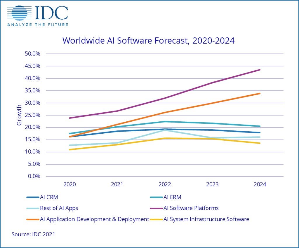В 2020 году на программное обеспечение приходилось 88% всего дохода на рынке ИИ. Однако этот сегмент растёт медленнее двух других. Среднегодовой темп роста для него прогнозируется равным 17,3%. Ровно половина выручки в этом сегменте приходится на приложения, в которых применены алгоритмы ИИ.