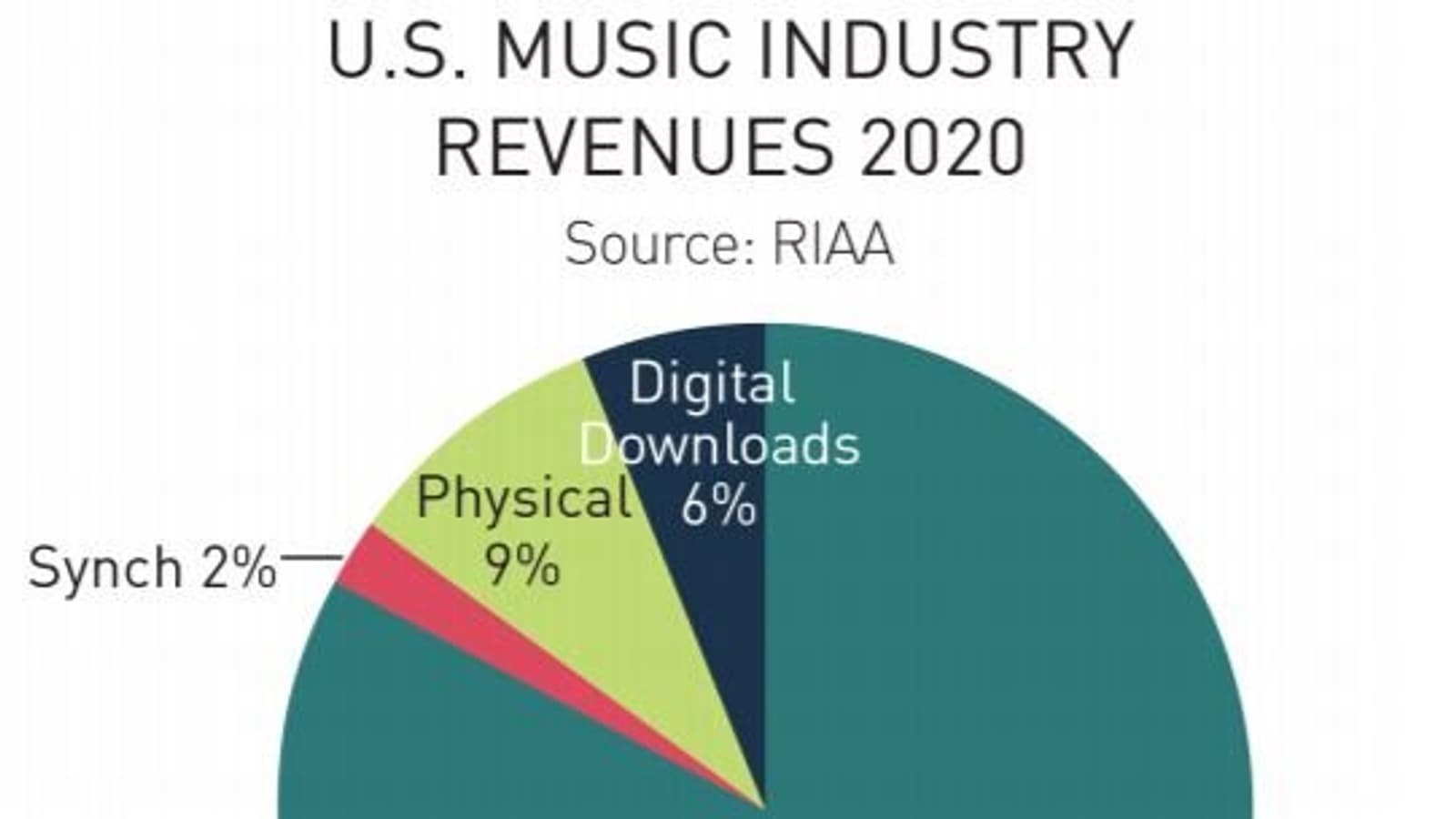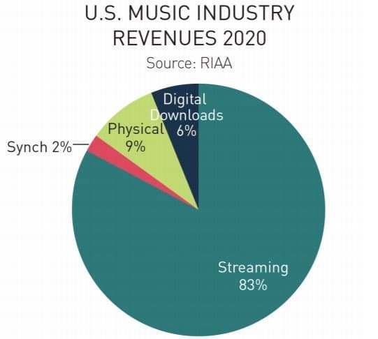 Как видно на диаграмме, на потоковое вещание в 2020 году пришлось 83% дохода звукозаписывающей отрасли. Продажи на физических носителях составили 9% рынка, а загружаемые звукозаписи — 6%. Оставшиеся 2% это доход от «синхронизации» звукозаписей с другими каналами распространения, то есть лицензионные платежи.