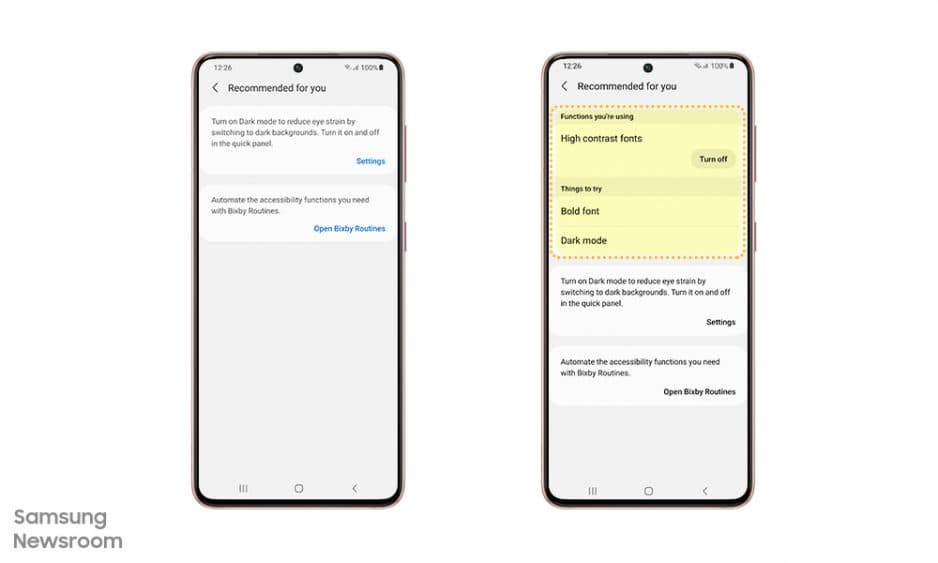 В рамках четвёртого принципа Samsung также улучшила удобство просмотра, повысила доступность интерфейса и добавила рекомендации дополнительных функций. Например, когда у пользователя с ослабленным зрением включены высококонтрастные шрифты, оболочка One UI предложит ему включить другие возможности, улучшающие «читаемость», такие как полужирный шрифт (Bold font) или тёмный режим (Dark mode) на экране «Рекомендовано для вас» (Recommended for you).