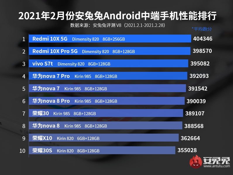 Статистика собрана в период с 1 по 28 февраля 2021 года. В рейтинге AnTuTu используются средние, а не самые высокие результаты. Для каждого смартфона учитывались результаты не менее 1000 тестов — модели с меньшим количеством тестов в рейтинг не попадают.