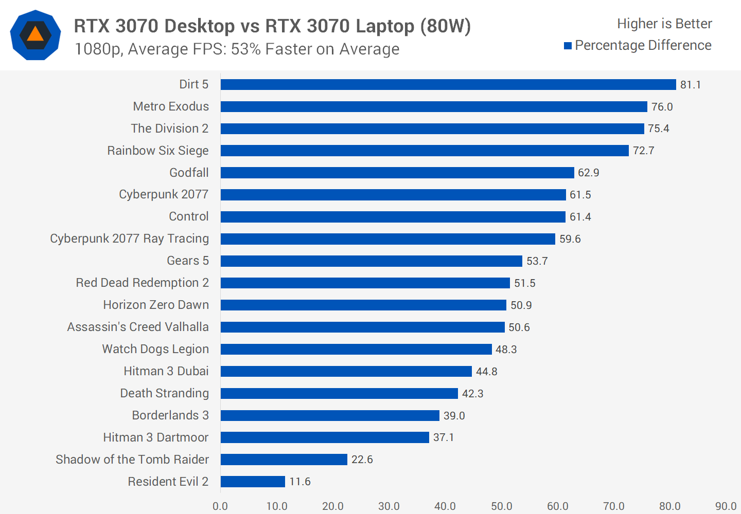 Если же мы говорим о разнице между настольной и мобильной картами, то даже в случае со 115-ваттной мобильной RTX 3070, настольная карта оказывается быстрее на 30-35% в среднем, а в некоторых играх разница может превышать 50-60% (в Full HD). Если же сравнивать с 80-ваттной мобильной картой, то настольная и вовсе оказывается быстрее в полтора раза, а в некоторых играх преимущество может достигать 70-80%.