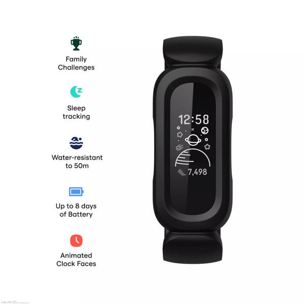 Fitbit Ace 3 оснащён 1,47-дюймовым экраном AMOLED разрешением 240 х 240 пикселей. Габариты устройства составляют 172 x 26 x 9 мм при массе 70 г. Судя по изображениям и описанию, этот браслет предназначен для детей.