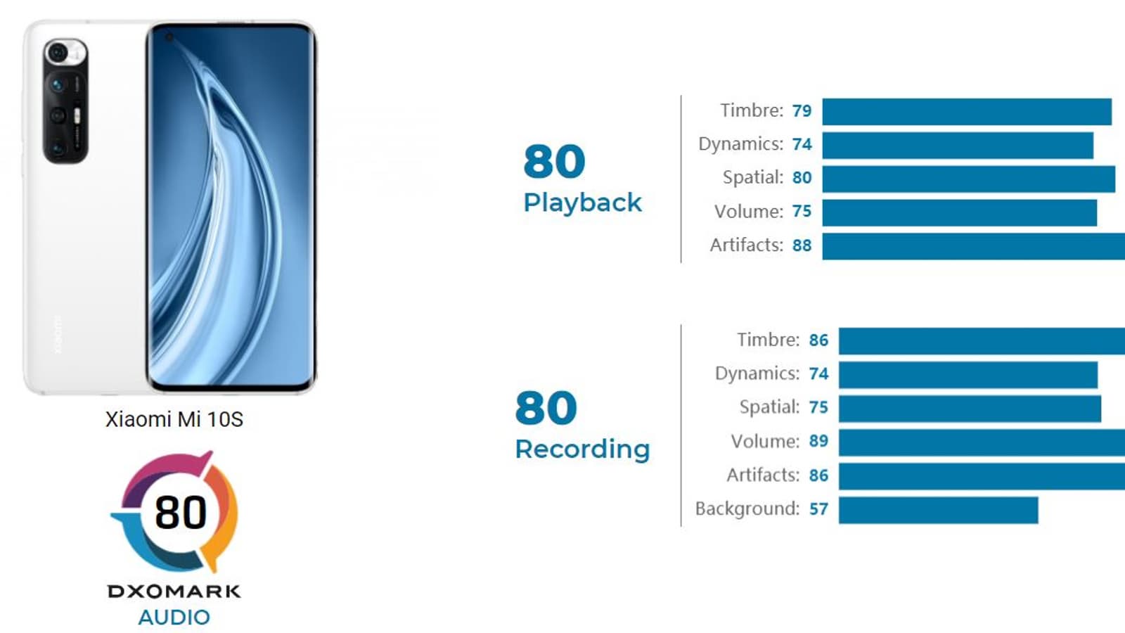 Подробный отчет о том, как звучит Mi 10S, специалисты DxOMark опубликуют позже, пока же представлена лишь диаграмма с баллами: Mi 10S получил по 80 баллов и за звучание, и за запись звука. Напомним, смартфон получил симметричные стереодинамики, над звучанием которых потрудились специалисты Harman Kardon.