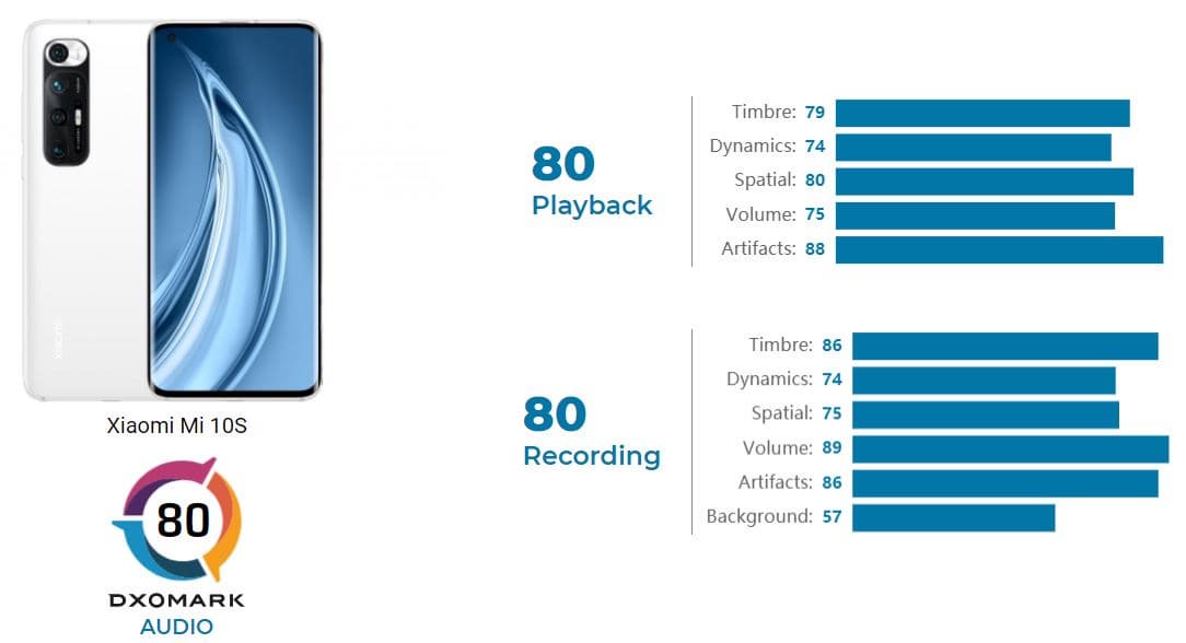 Подробный отчет о том, как звучит Mi 10S, специалисты DxOMark опубликуют позже, пока же представлена лишь диаграмма с баллами: Mi 10S получил по 80 баллов и за звучание, и за запись звука. Напомним, смартфон получил симметричные стереодинамики, над звучанием которых потрудились специалисты Harman Kardon.