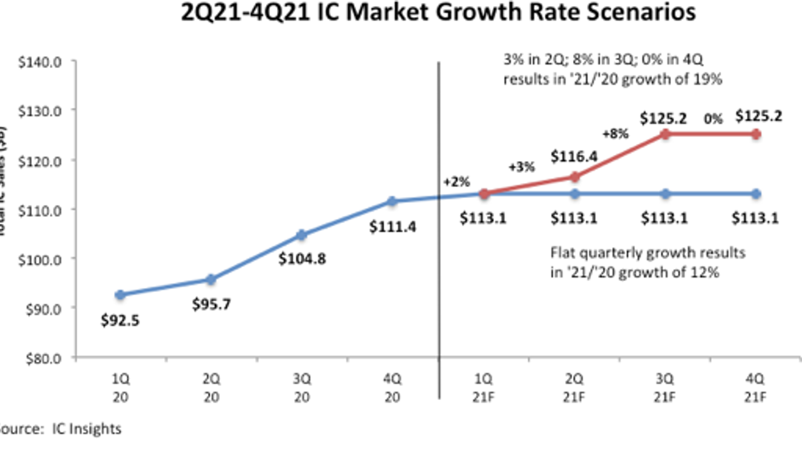 В целом за 2021 год рынок вырастет на 19%. Аналитики IC Insights уточняют, что это довольно консервативный прогноз. Он сделан в предположении, что основную часть роста обеспечит увеличение поставок в количественном выражении на 17%. Средняя цена за год вырастет на 1%.