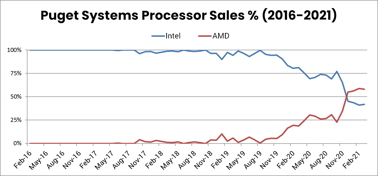 Судя по графикам, сколько-нибудь заметные продажи ПК с процессорами AMD наметились в 2017 году — после выхода первого поколения Ryzen. Но, несмотря на то, что уже это поколение выглядело очень привлекательно, продажи у Puget Systems были крайне скромными. Выход Ryzen 2000 ожидаемо не дал существенного подъёма, а вот Ryzen 3000 за счёт внушительного прироста производительности заинтересовало производителя и пользователей намного больше, что позволило доле компьютеров на основе CPU AMD стремительно расти и уже в ноябре достичь 50%. Сейчас на долю таких CPU приходится около 55%.